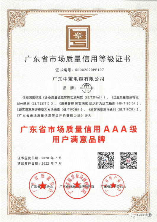 為加快推(tuī)進廣東省社會信用體係(xì)建設,營造誠實、自律、守信的社會信用環境,近日,廣東省質量協會、廣東卓(zhuó)越質量品牌研究院、廣(guǎng)東省用戶委員會聯合公示了2020年廣東省市場質量信用A等(用戶滿意)企業名單。抖抈APP電纜(lǎn)憑借良好的信譽(yù)和口碑順利通過評(píng)審,被評為“廣東省市場質量(liàng)信用AAA級用(yòng)戶滿意品牌(pái)”。